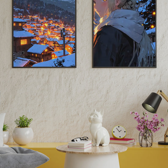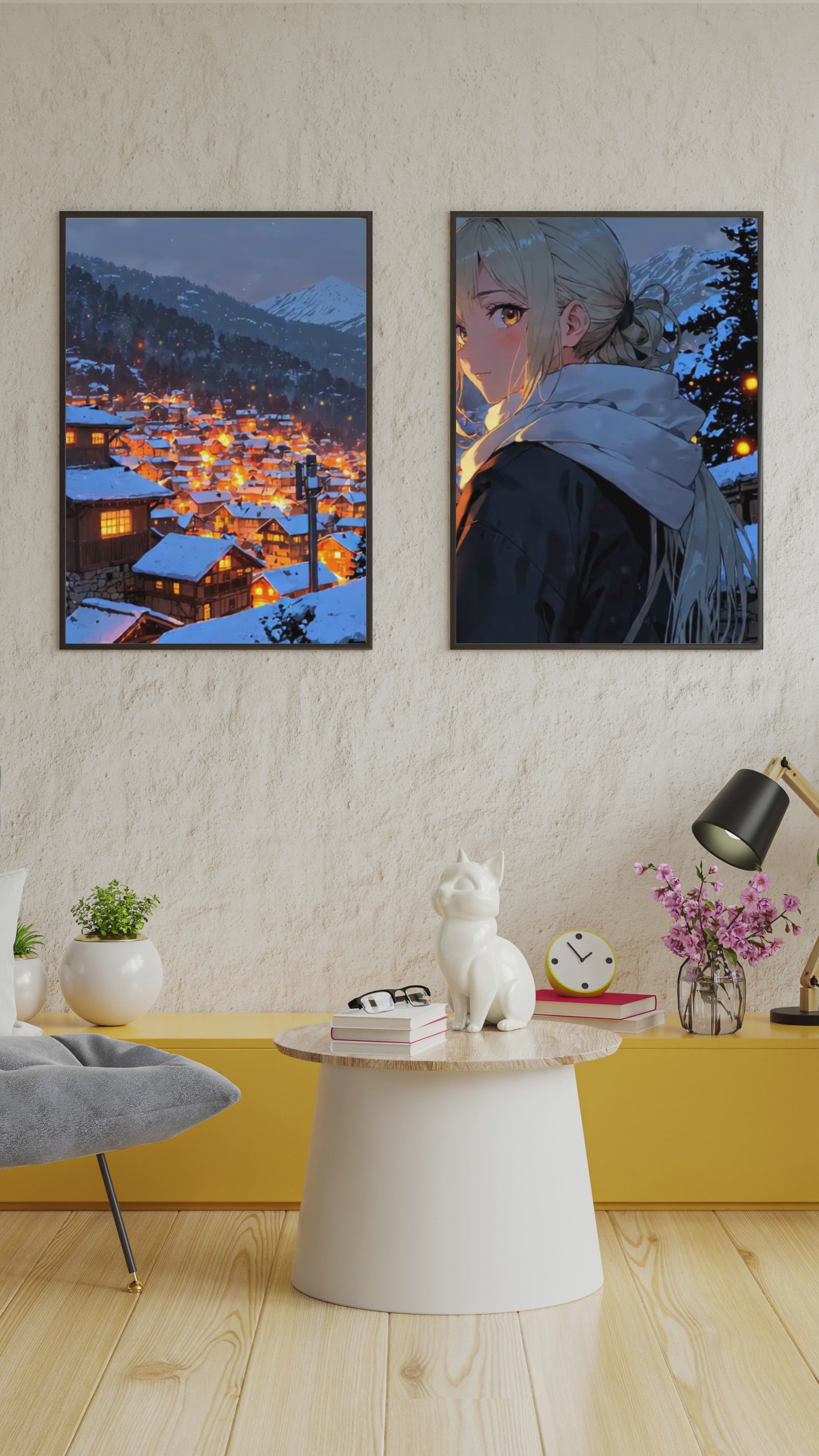 Winter Glow” is an atmospheric, anime-inspired work of art that combines warmth and cold in a single moment. A young woman stands in front of a snow-covered mountain landscape, while the lights of the village below her glow like golden memories. Her gaze over her shoulder - tender, thoughtful, almost fleeting - seems like a frozen moment between farewell and hope. Poetic, romantic and full of winter magic.
