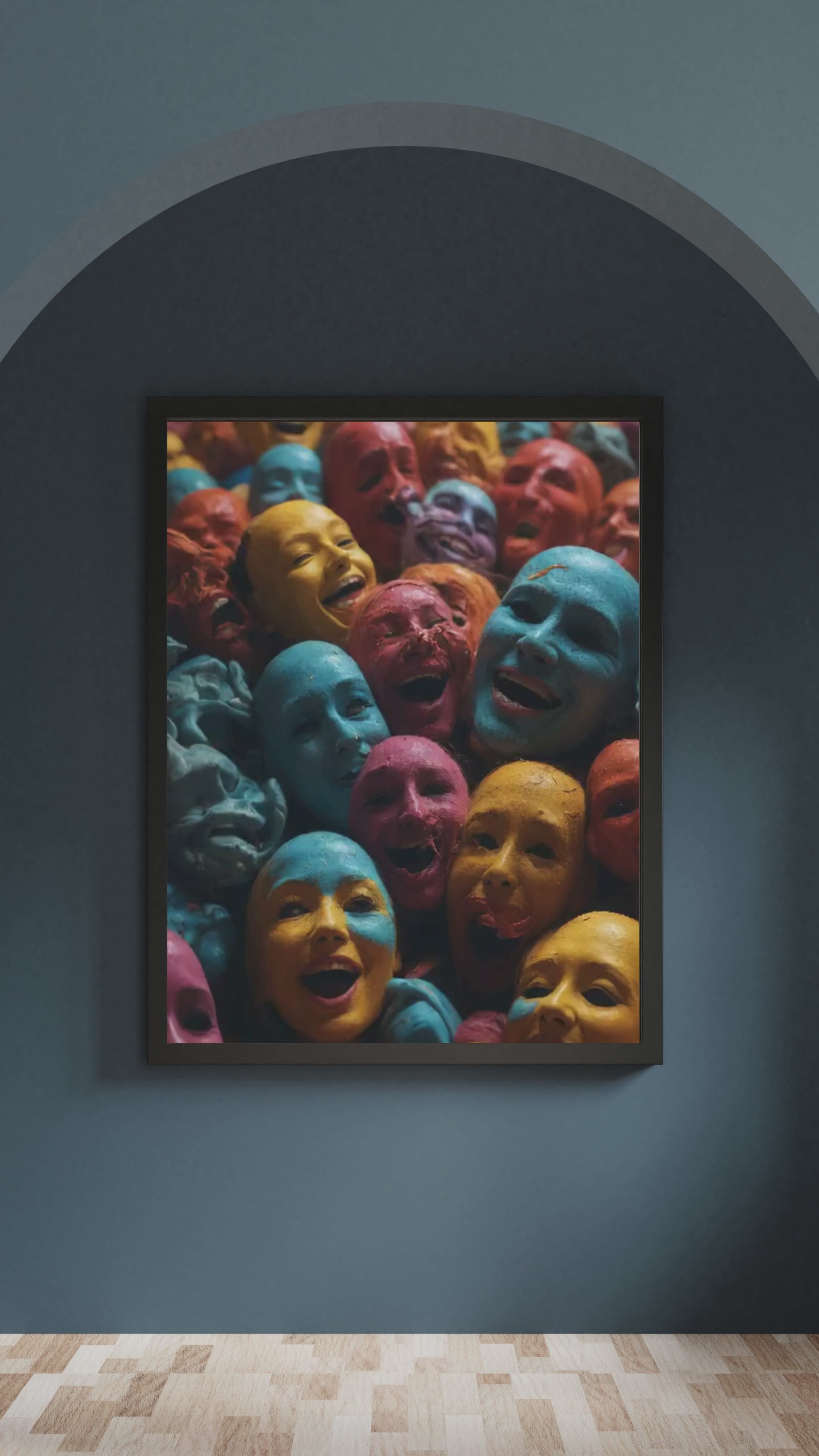 “Global Psychosis” is a jarring, AI-generated vision that collides celebration with chaos. A mass of vibrant, painted faces — all laughing, all frozen — stretches into an overwhelming sea of synthetic emotion. It’s beautiful. It’s terrifying. It’s humanity on the edge of itself: unified in expression, divided in reality. Beneath the bright pigments lies a deeper question — are we smiling, or are we screaming?
