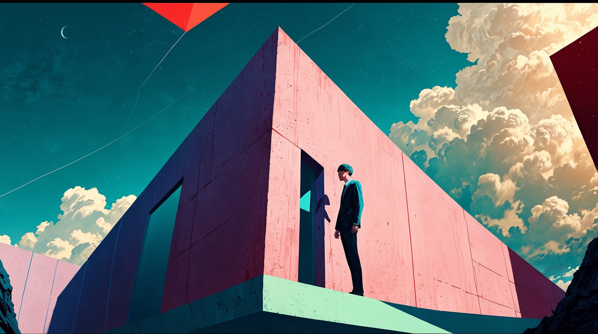 “Threshold Protocol” is a surreal, AI-generated artwork that captures the moment just before transformation. A lone figure stands before a sharp, geometric doorway embedded in an abstract, monolithic structure — poised between shadow and light, clarity and question. Above him, the cosmos curves with impossible serenity, and the clouds burn with anticipation. This is not just architecture. It's symbolism. A visual metaphor for standing at the edge of a new idea, identity, or reality.