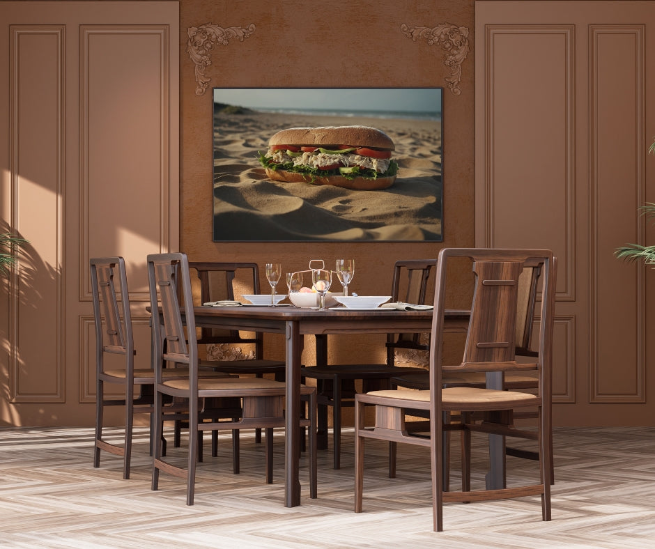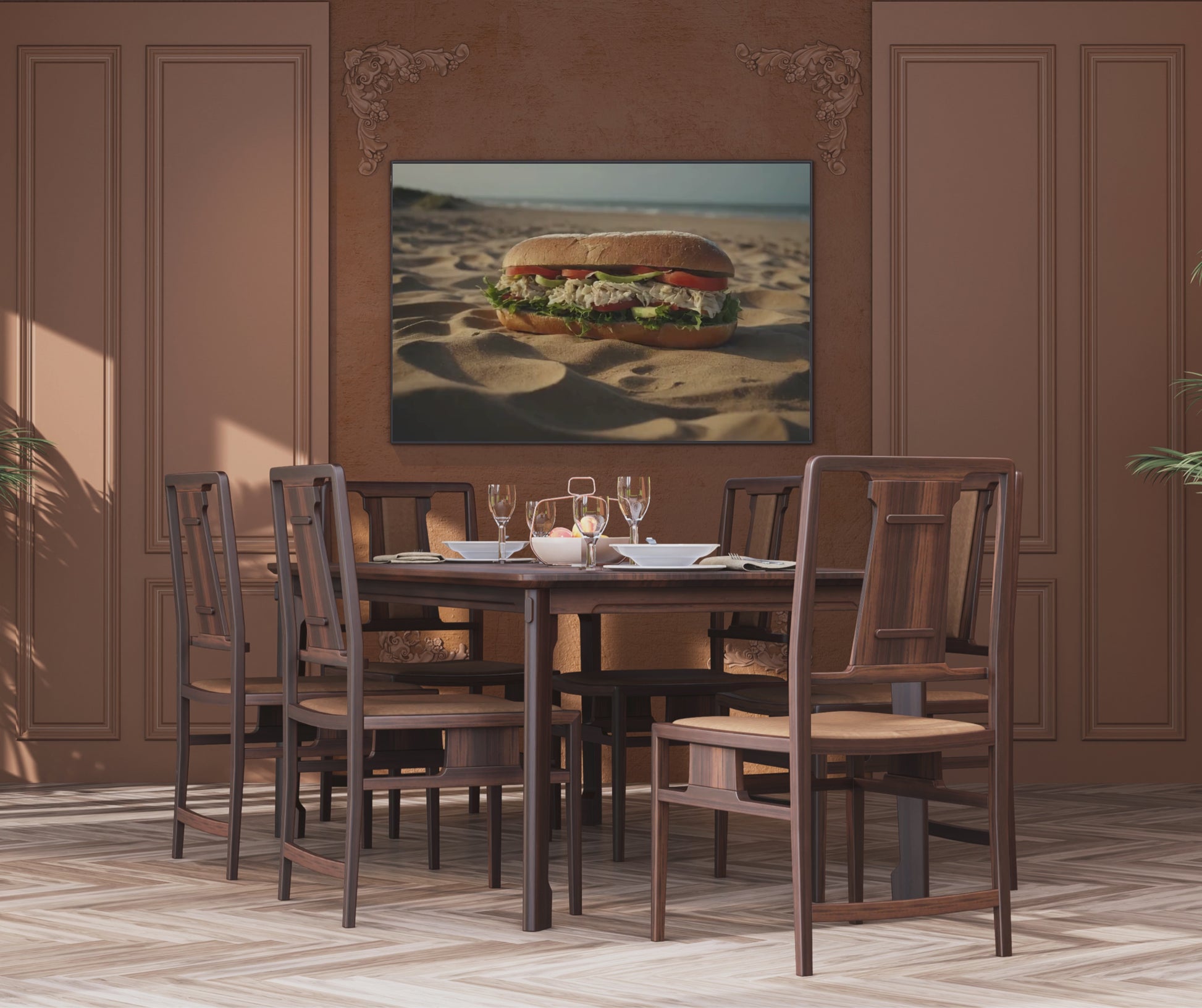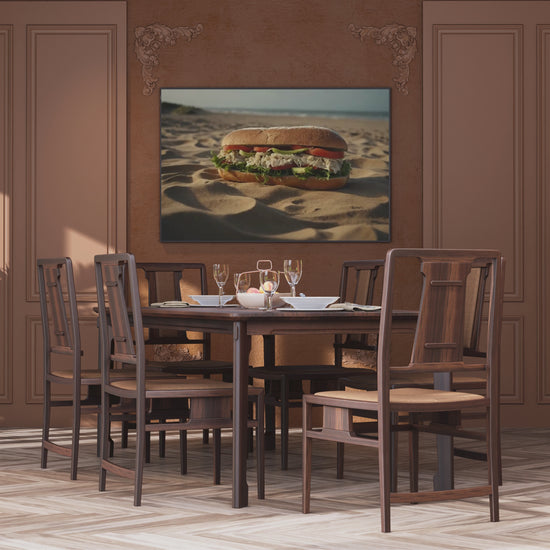 “Beach Bite” is a humorous, AI-generated food artwork that captures a juicy sandwich moment in the middle of the sand. Fresh bread, crisp lettuce, creamy chicken and sun-ripened tomatoes meet the soft wave pattern of the beach - as if hunger itself had decided to go on vacation. A surreal, appetizing eye-catcher with a summery wink.